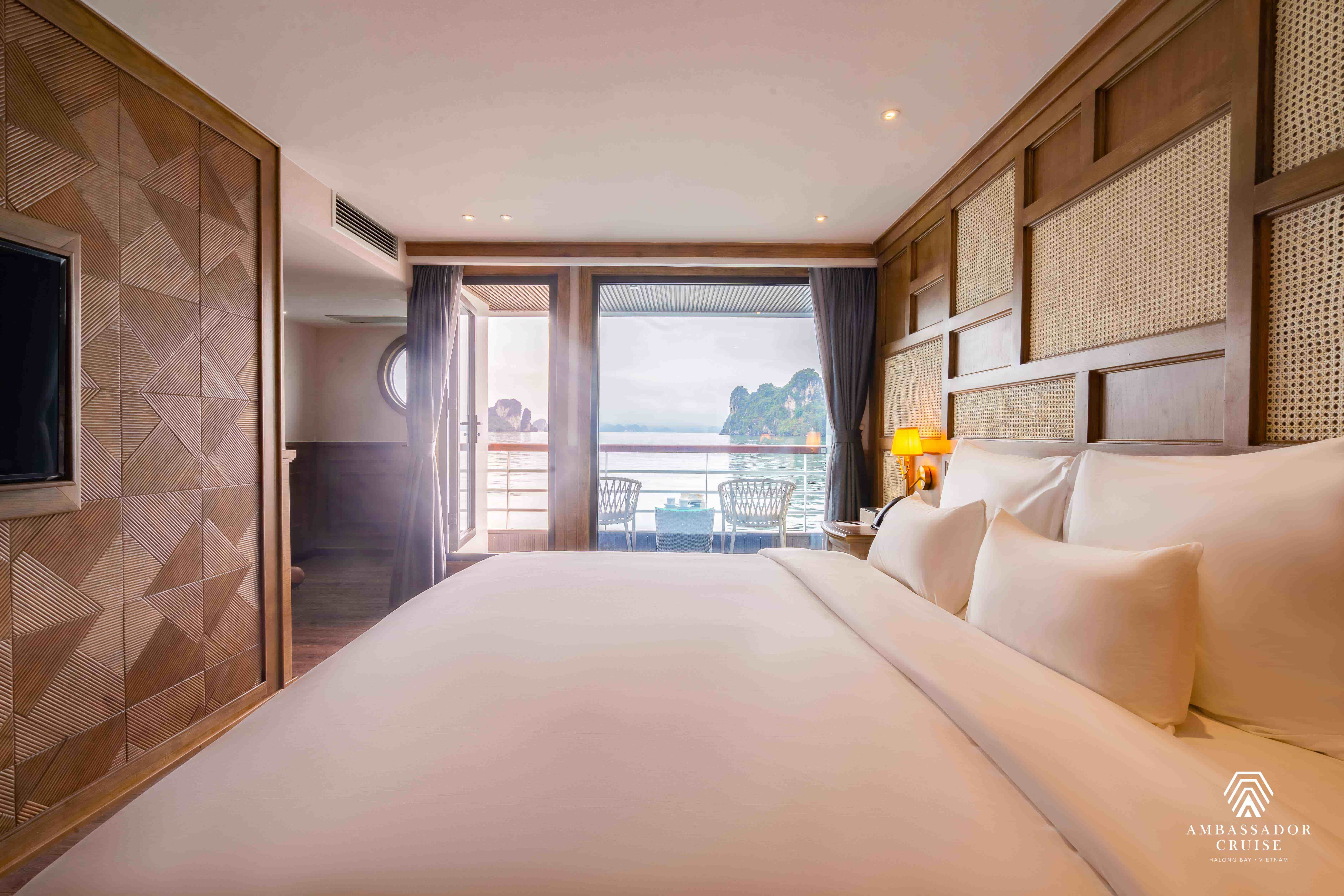 Nằm trên tầng hai, các phòng Ambassador Suite là những căn phòng rộng nhất trên du thuyền và đi kèm với ban công riêng.