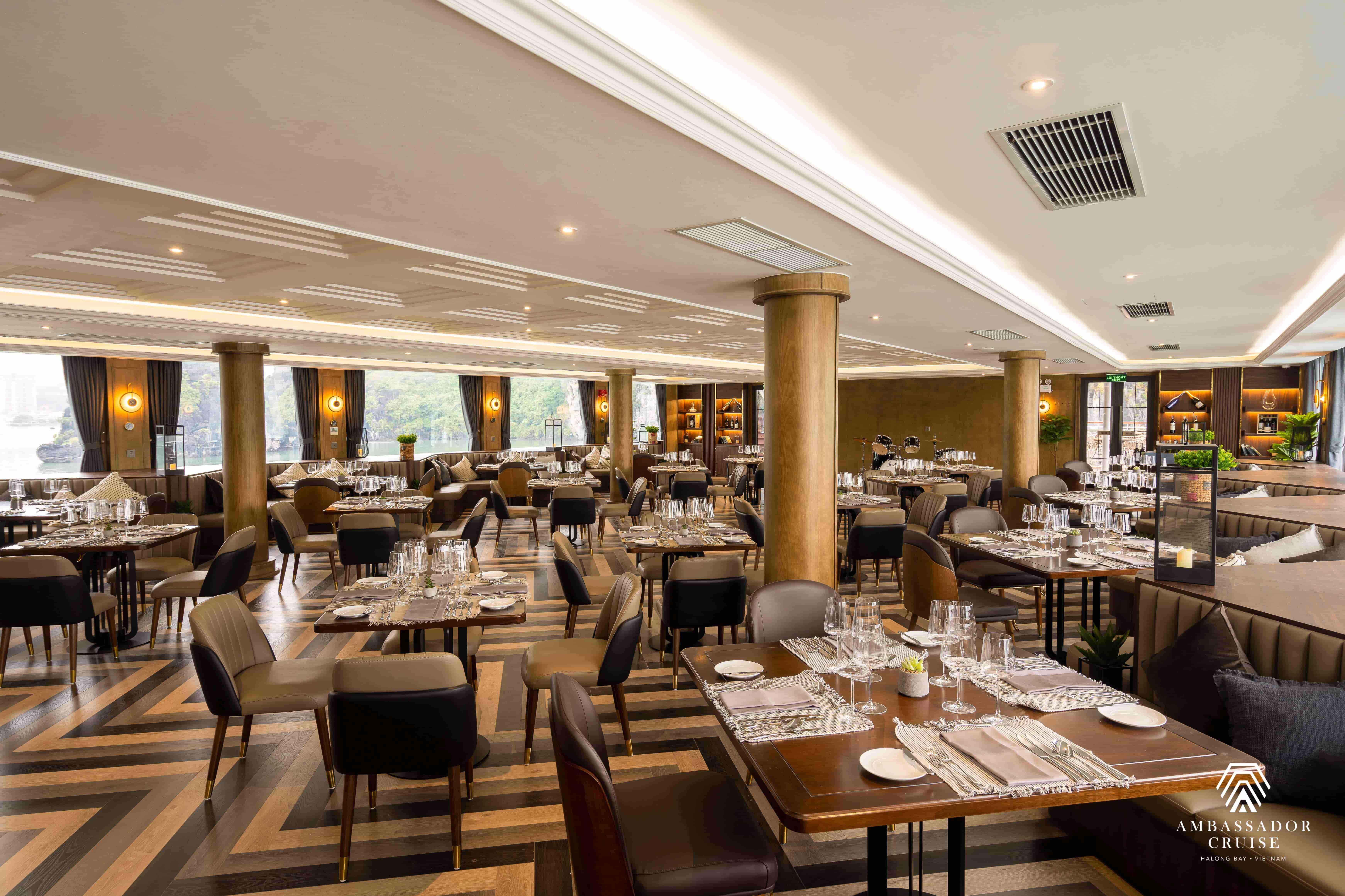 Du thuyền có hai nhà hàng sang trọng nằm trên tầng ba và tầng bốn, mỗi nhà hàng đều có các phòng ăn riêng biệt dành cho khách muốn tận hưởng không gian riêng tư hơn.