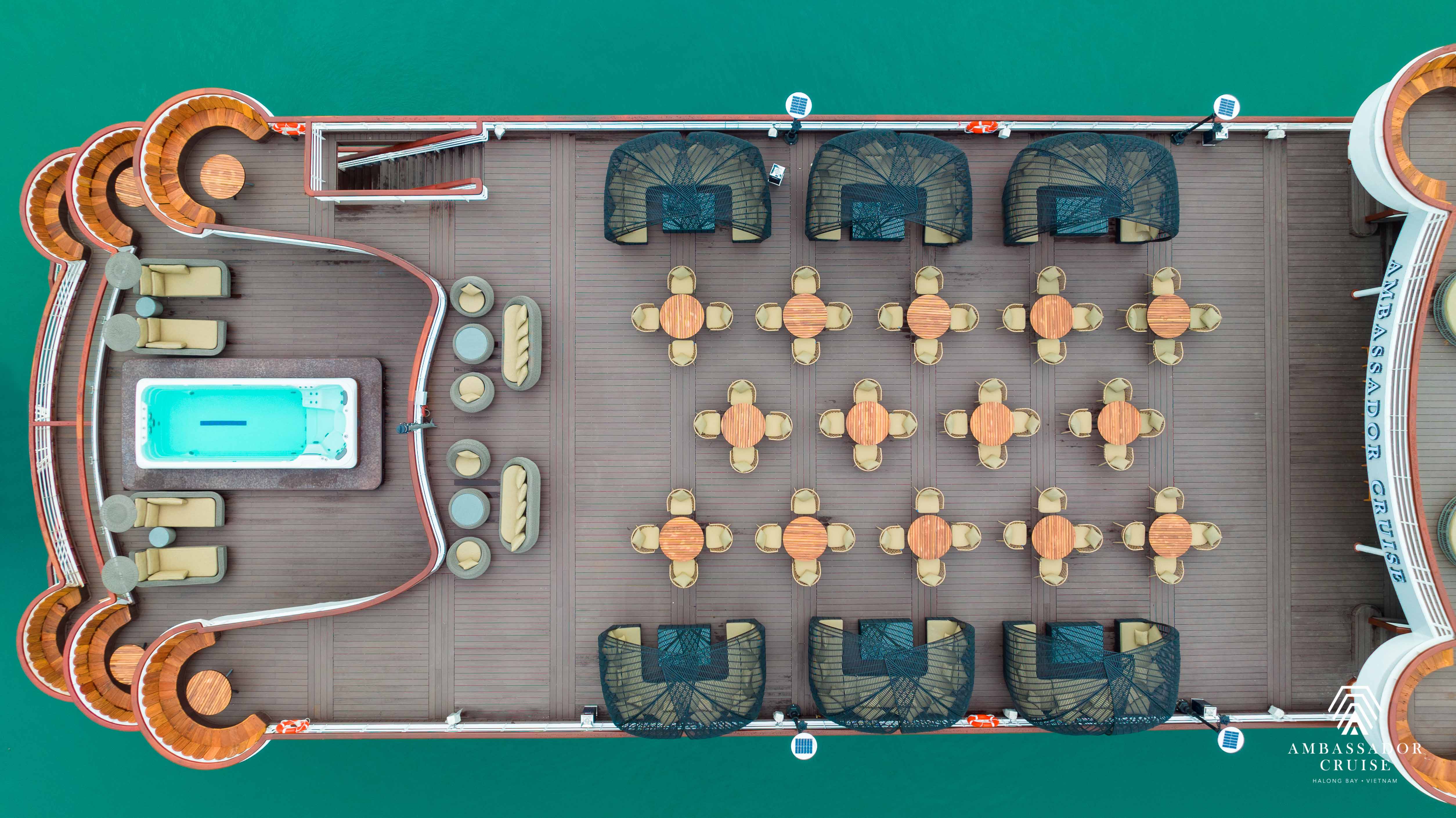 Du thuyền có một tầng sân thượng rộng với sundeck kép nơi bạn có thể thư giãn, tắm nắng, giao lưu và tham gia các hoạt động cùng bạn bè.