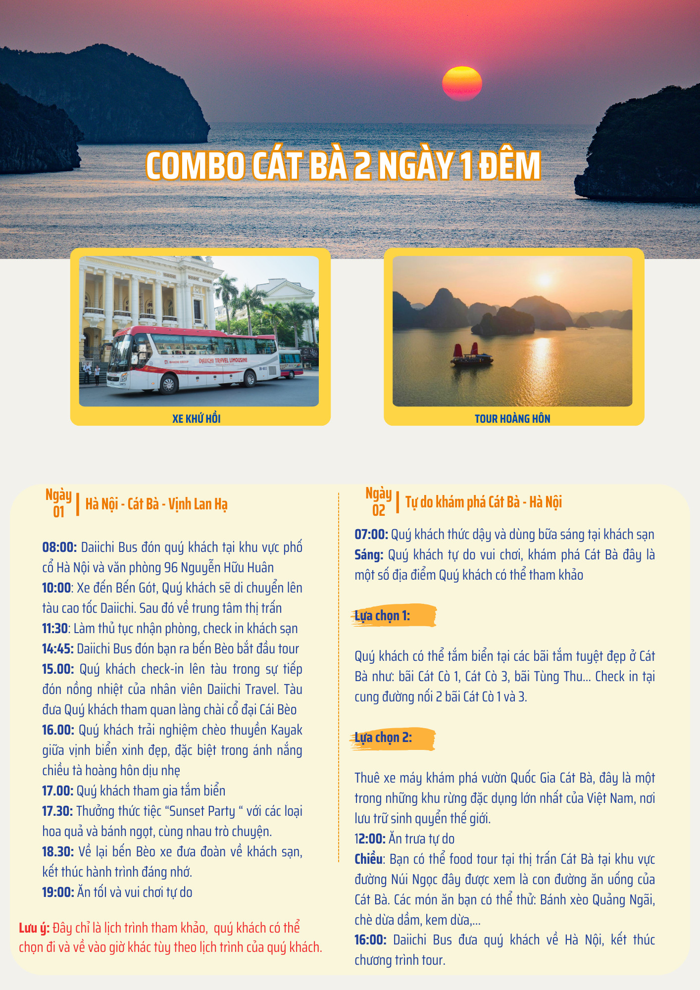 Bảng giá combo xe khứ hồi Hà Nội - Cát Bà + tour Sunset nửa ngày