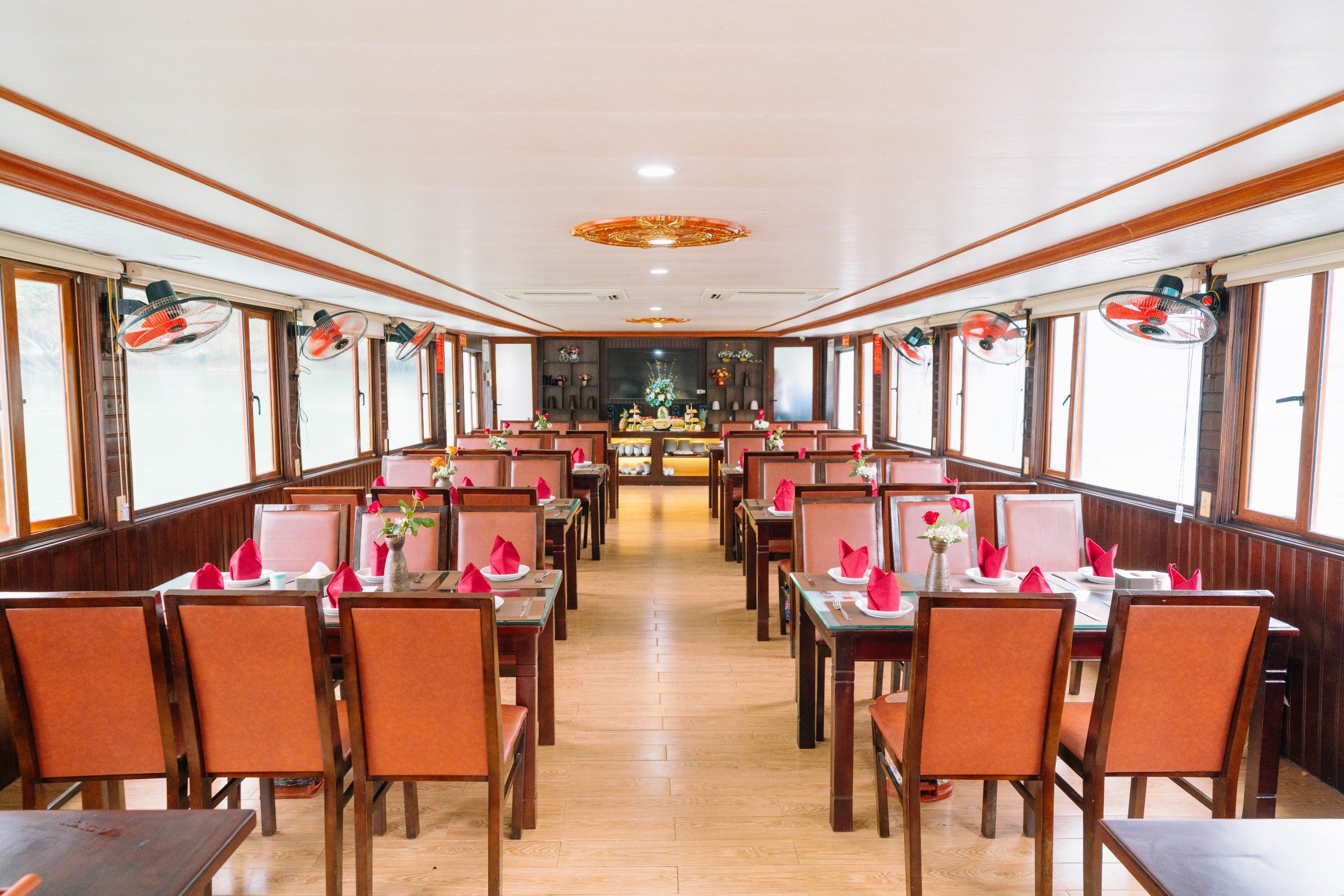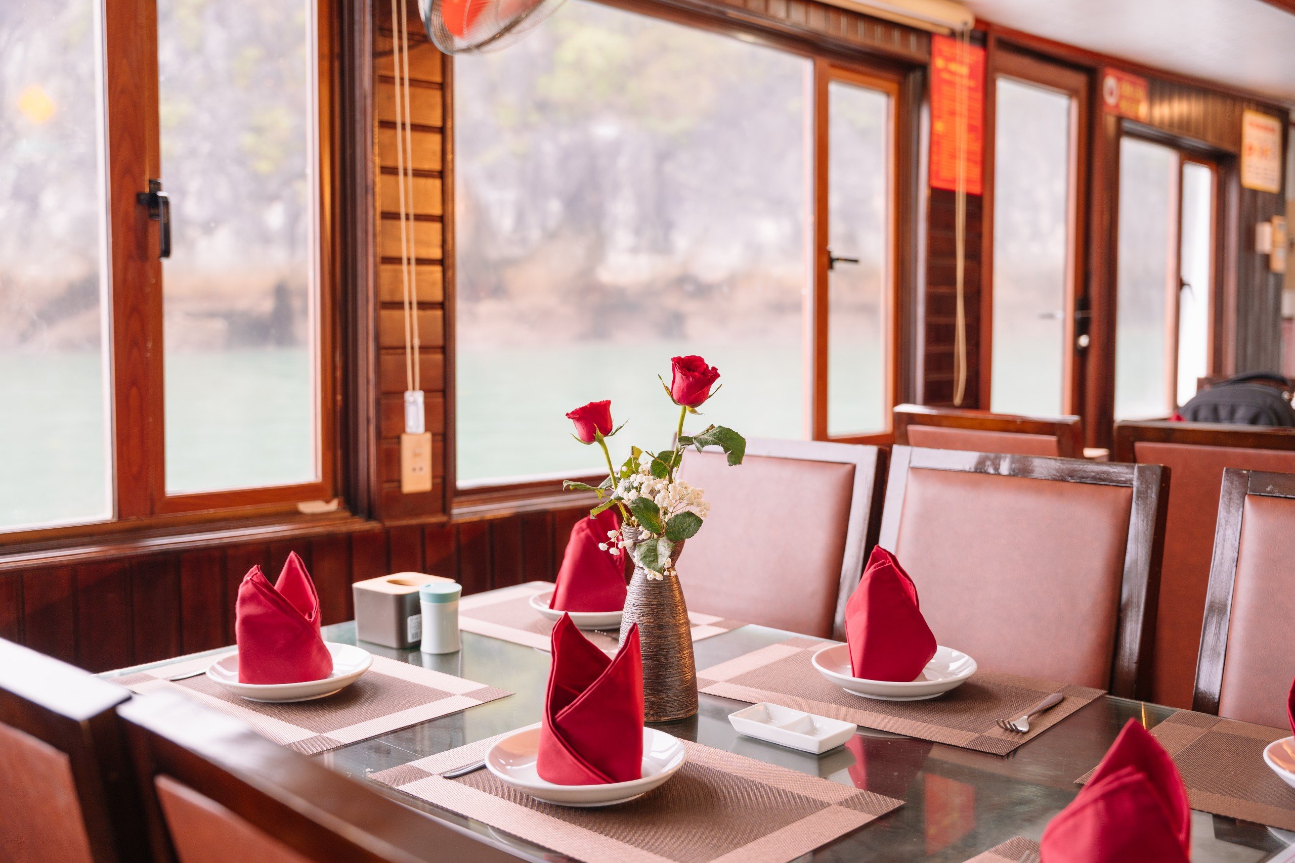 - Nhà hàng tại tầng 1 với sức chứa 60 khách với không gian kết hợp những cửa sổ lớn trong suốt, mang đến trải nghiệm tuyệt vời khi quý khách vừa dùng bữa vừa ngắm nhìn vẻ đẹp hùng vĩ của vịnh Lan Hạ.