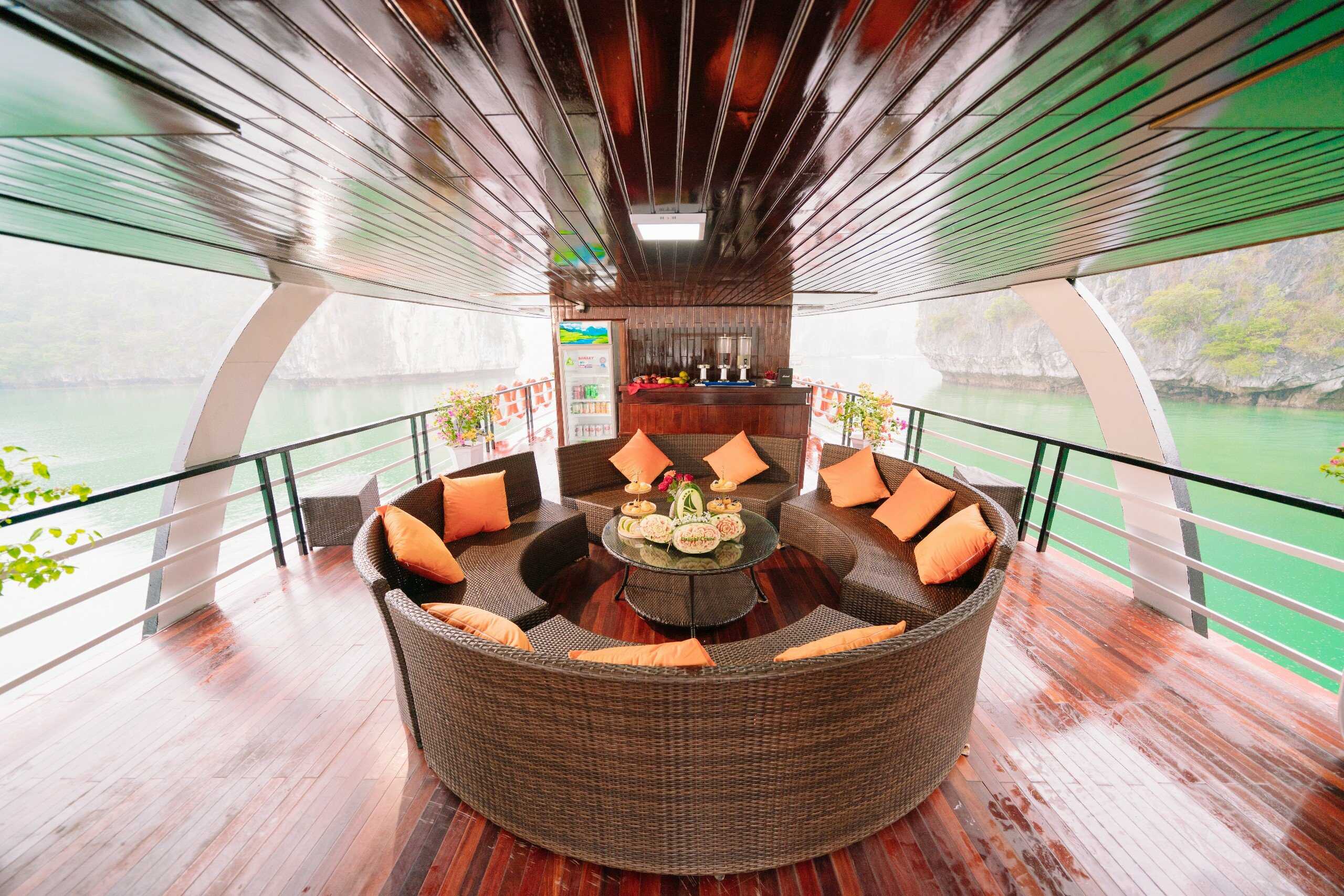 - Phía sau là quầy bar phục vụ đồ uống và đồ ăn nhẹ, kết hợp với bàn tròn rộng và ghế nằm tắm nắng. Quý khách có thể gọi một ly cocktail để nhâm nhi và thư giãn ngắm cảnh, hoặc ngả mình trên sundeck êm ái khi tàu lướt nhẹ trên mặt nước.