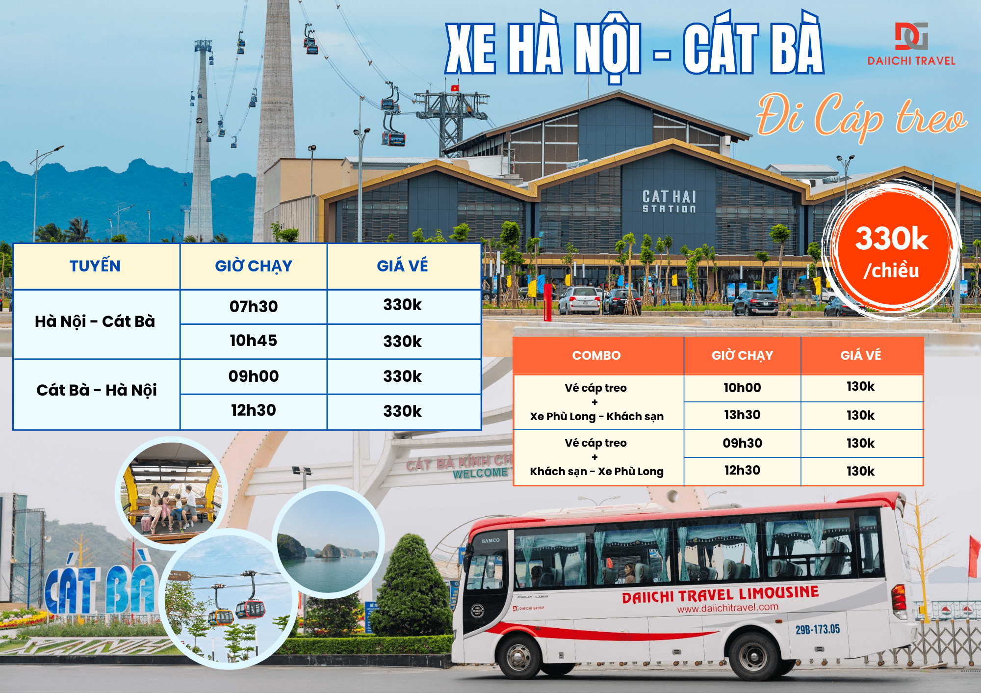 Nhằm tạo điều kiện tốt nhất giúp du khách có thể tiết kiệm thời gian, có thể du ngoạn đảo Cát Bà một cách nhanh chóng, Daiichi Travel ngoài áp dụng di chuyển bằng tàu cao tốc chỉ mất 5 phút sẽ áp dụng cả hình thức di chuyển bằng cáp treo Cát Bà.