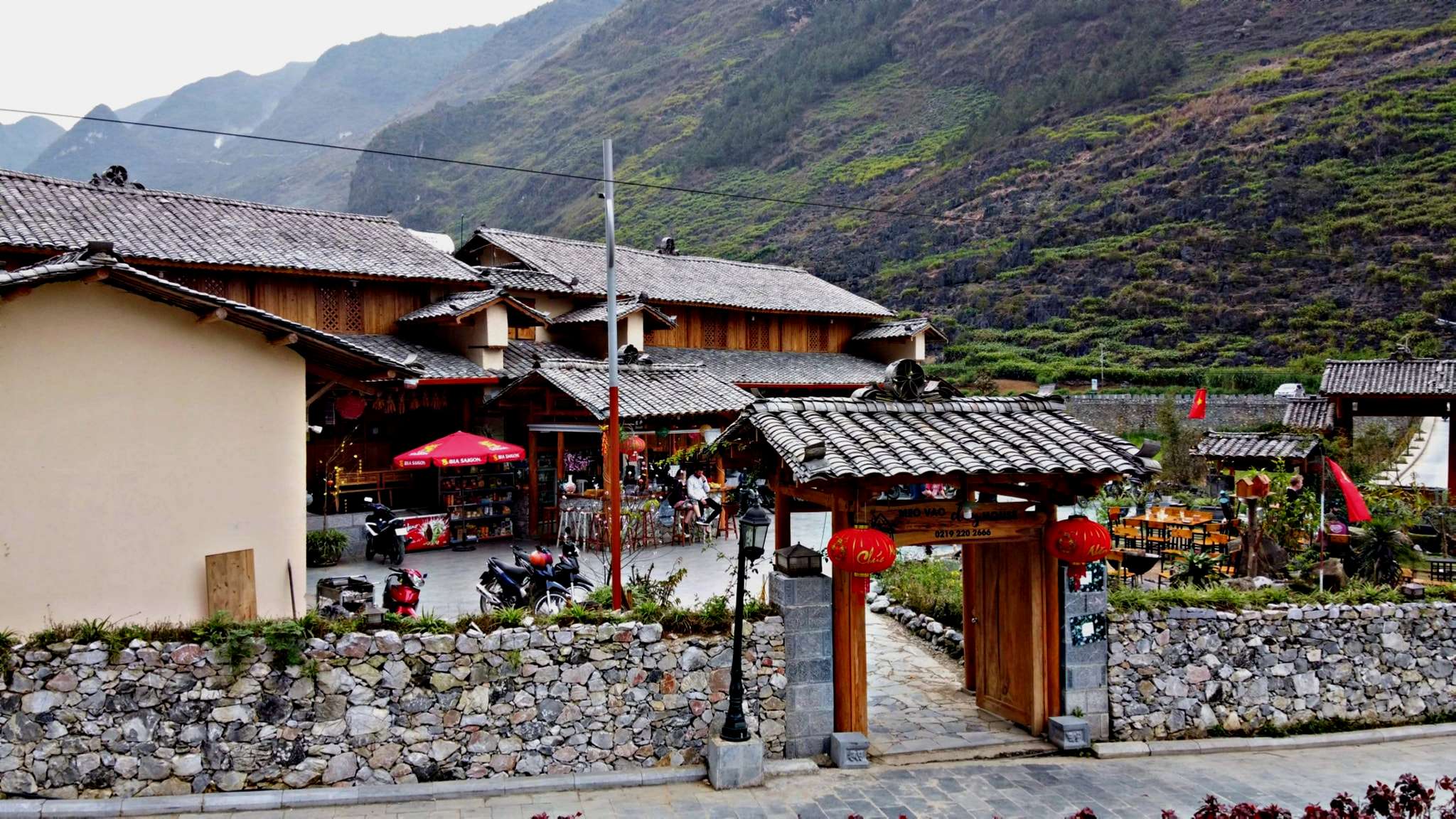 Nhà hàng được thiết kế từ gỗ và đá, không gian ấm cúng, phục vụ các món đặc sản Hà Giang.