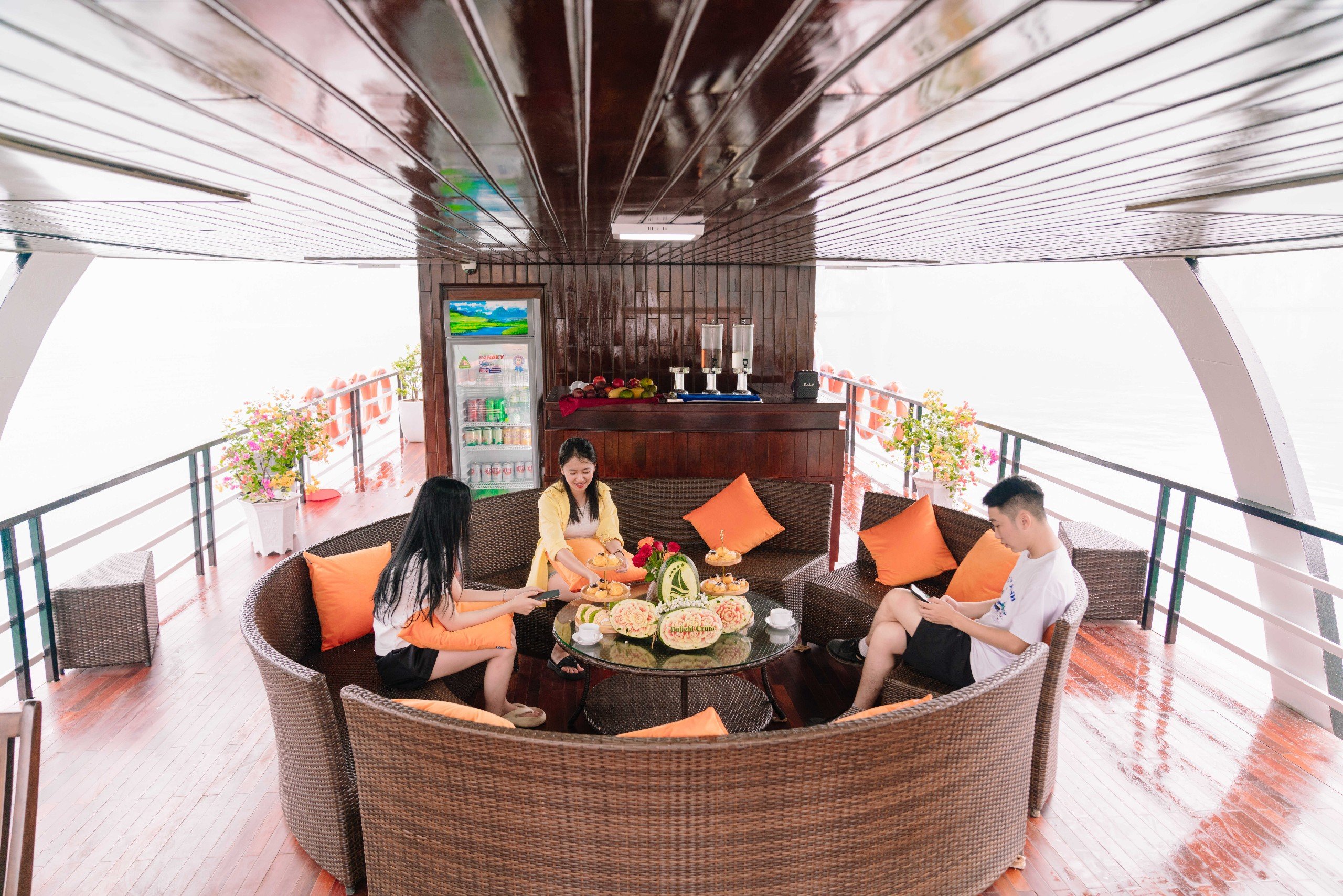 17.30: Thưởng thức tiệc “Sunset Party “ với các loại hoa quả và bánh ngọt, cùng nhau trò chuyện và nghe hướng dẫn viên của Daiichi Travel kể về những câu chuyện truyền kỳ gắn liền với vịnh Lan Hạ xinh đẹp.