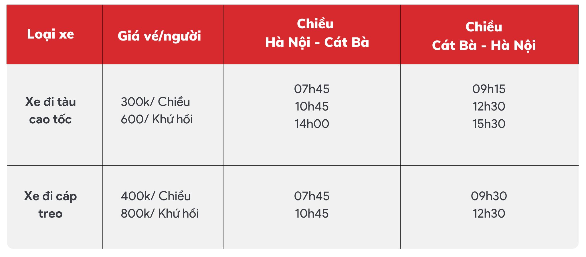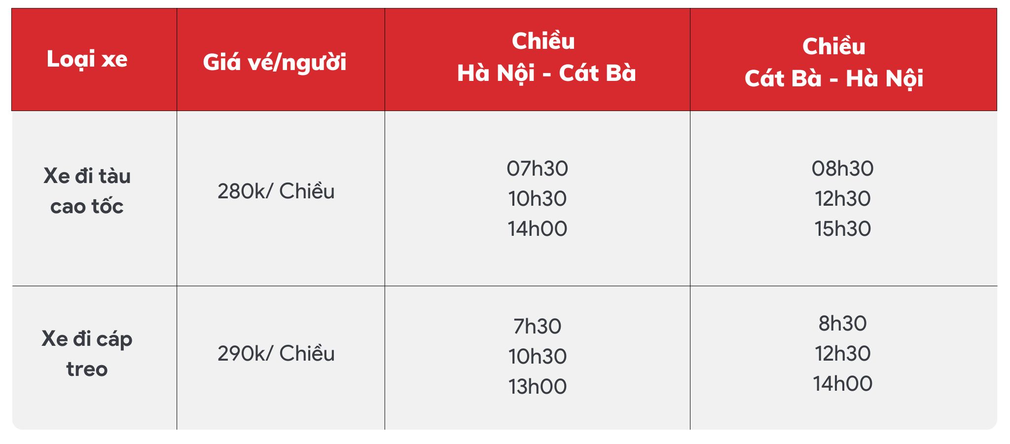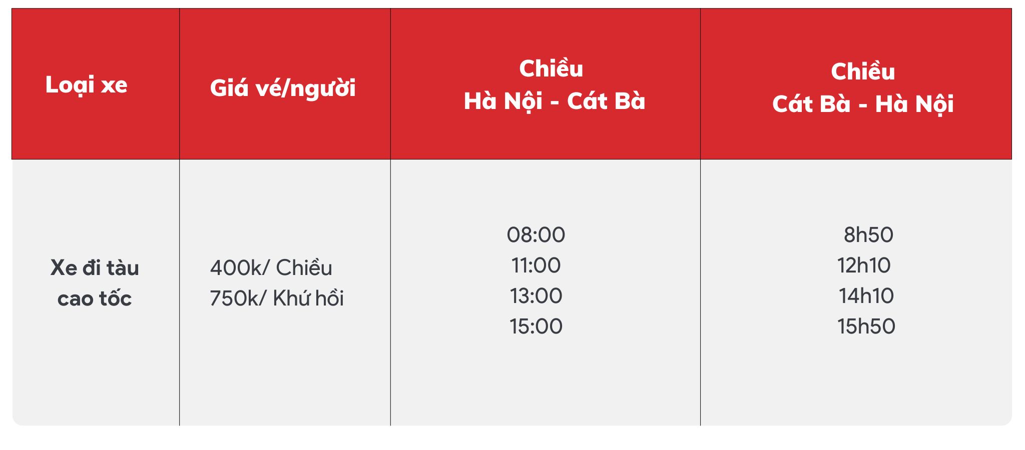 | Giá vé | Chiều Hà Nội - Cát Bà | Chiều Cát Bà - Hà Nội |