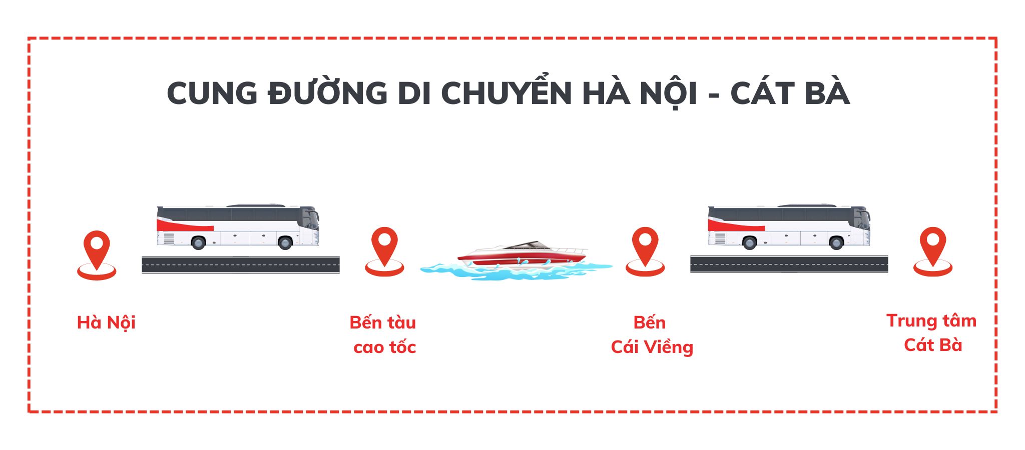 Cách di chuyển: Từ Hà Nội di chuyển theo cao tốc Hà Nội Cát Bà -> Bến phà cao tốc Gót -> Di chuyển qua biển bằng cao tốc -> Đến bến Cái Viềng -> Di chuyển bằng ô tô về thị trấn Cát Bà