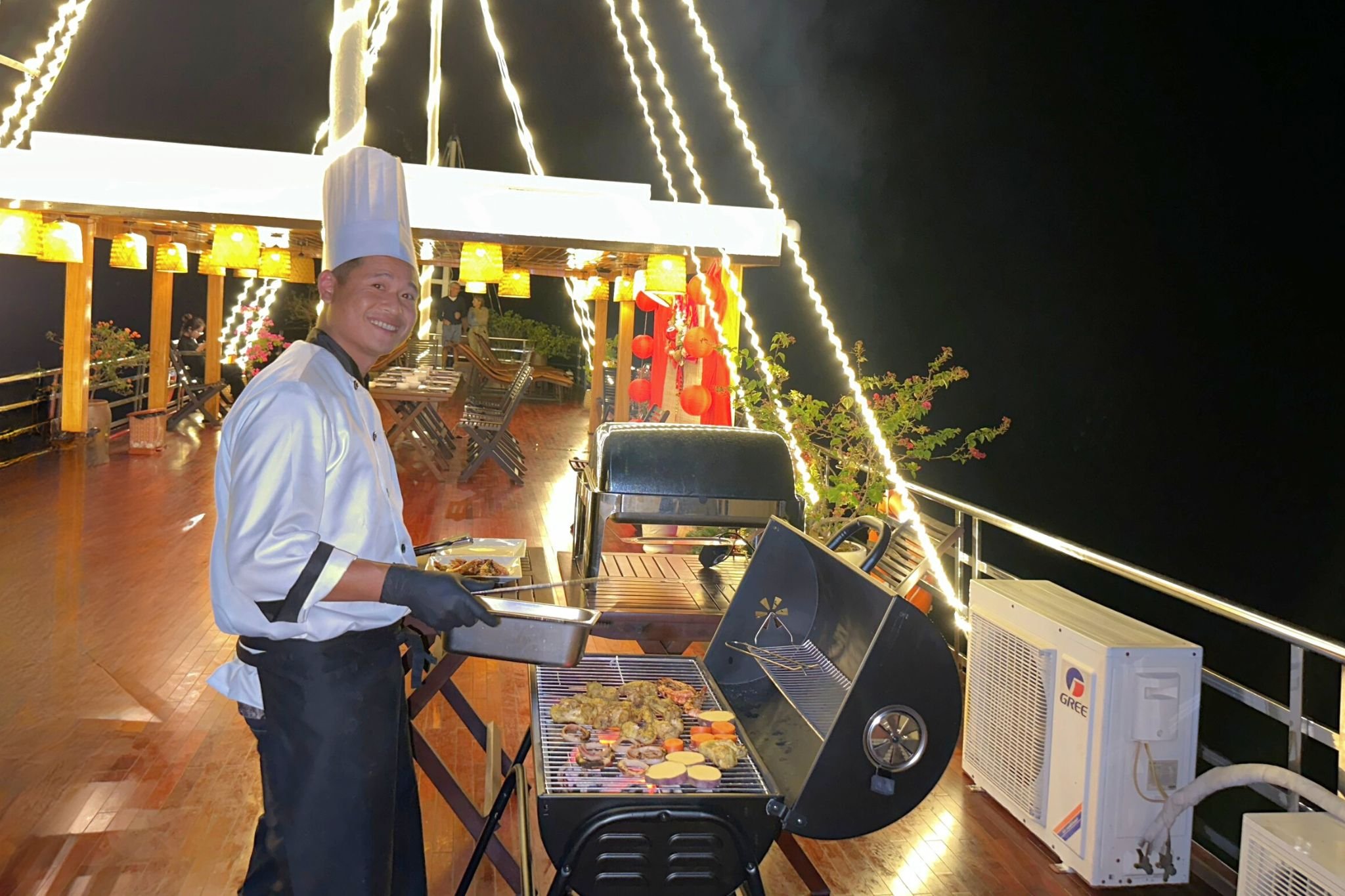 17.30 – 19.15: Quay trở lại tàu để tắm nước ngọt và thưởng thức thời gian thư giãn trên sundeck và trải nghiệm buổi học nấu món ăn truyền thông Việt Nam trước khi thưởng thức bữa tối BBQ trên tàu.