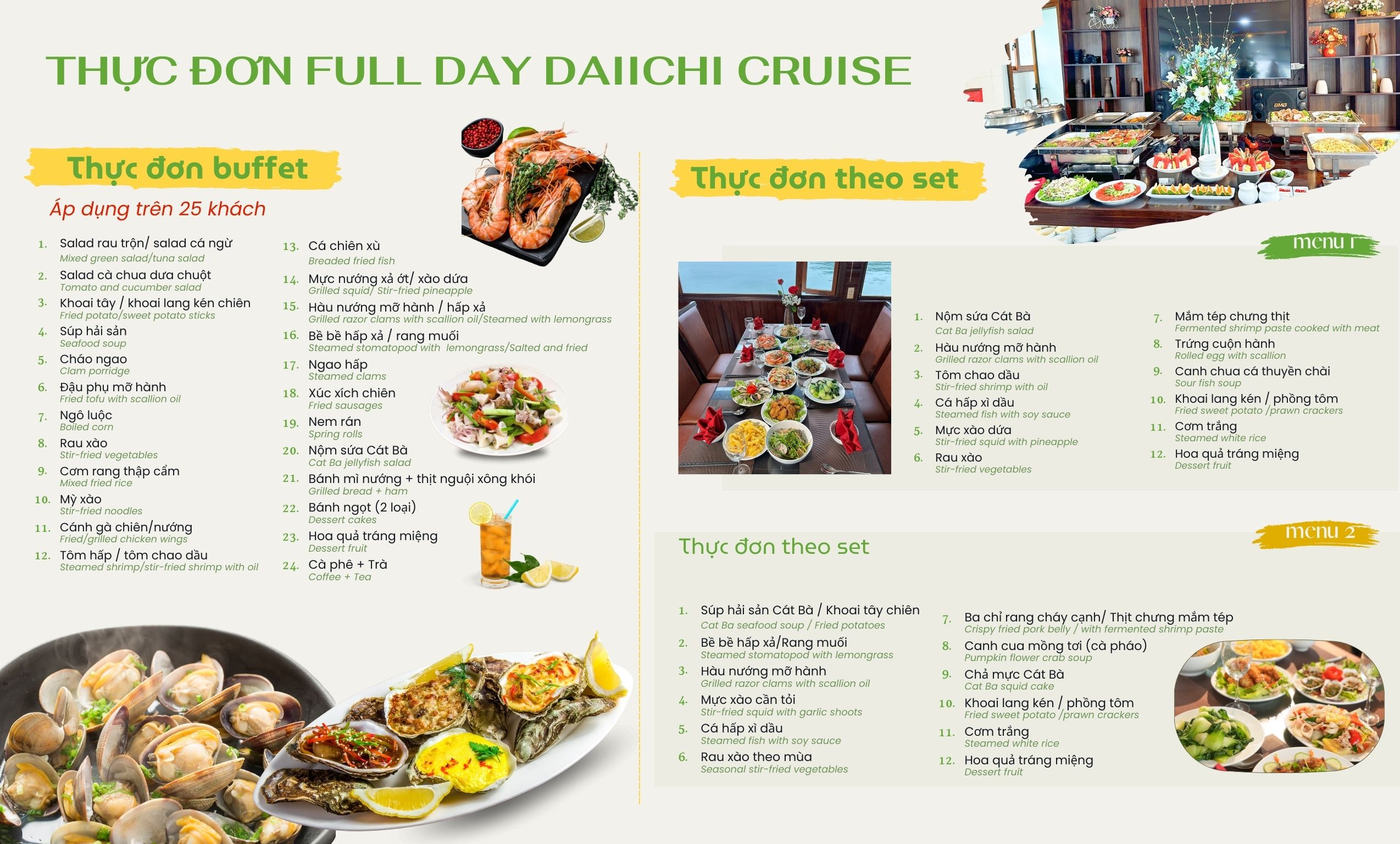 12h00 - 13h00: Quý khách quay trở lại du thuyền Daiichi tắm tráng và sau đó thưởng thức bữa trưa hải sản trên du thuyền.