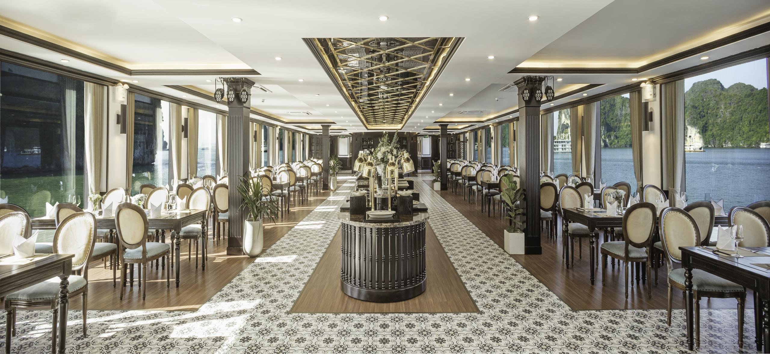 Nhà hàng Bayside Delight, với diện tích 300m², có thể phục vụ lên đến 180 khách trong không gian phù hợp cho cả tiệc set menu và buffet, nằm trên tầng 2 của du thuyền.