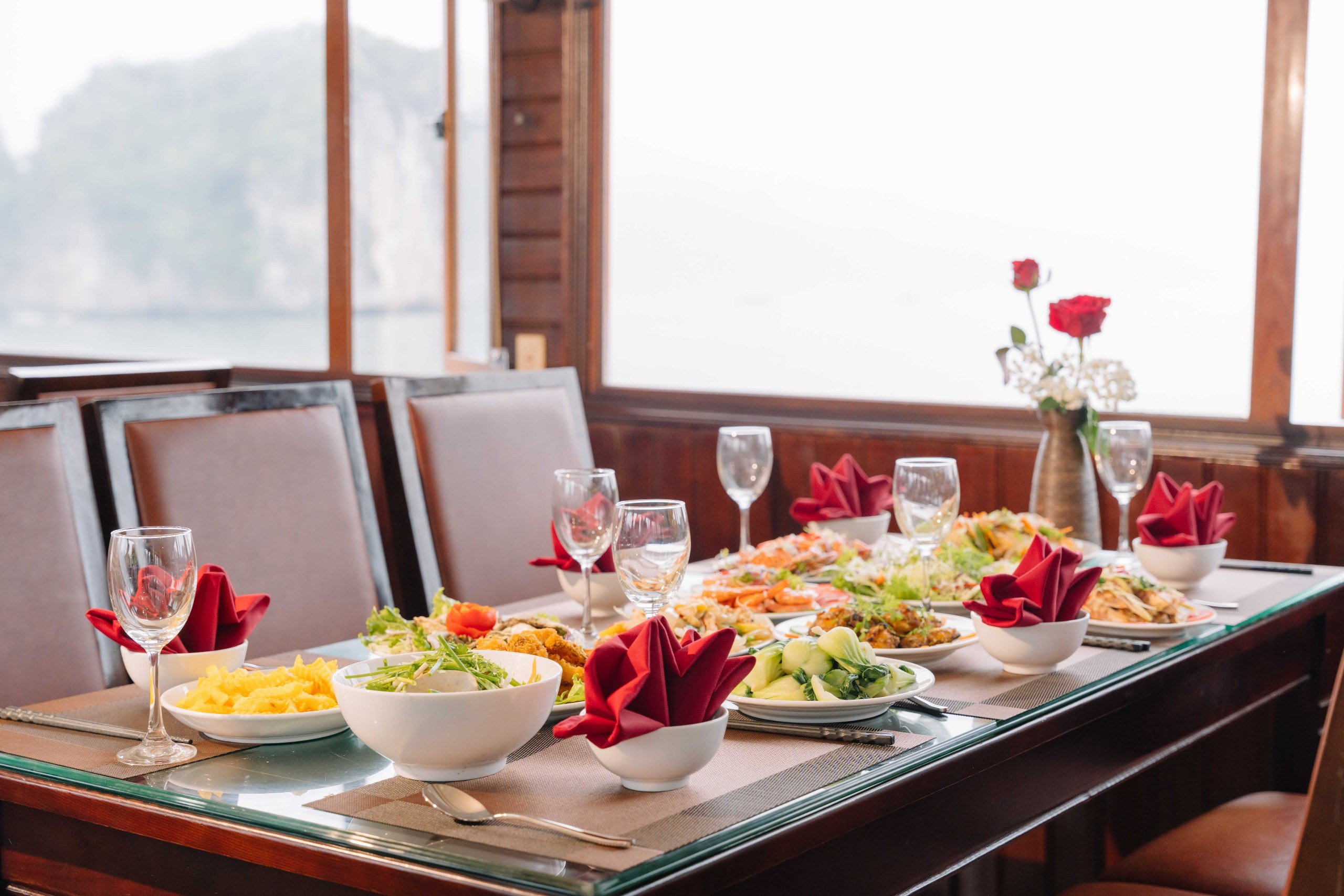 Tầng 1 là khu vực nhà hàng, Quý khách sẽ thưởng thức bữa trưa tại đây. Với những cửa sổ rộng lớn trong suốt đem đến cho quý khách trải nghiệm ăn trưa tuyệt vời nhất khi vừa dùng bữa vừa ngắm nhìn vẻ đẹp vịnh Lan Hạ.