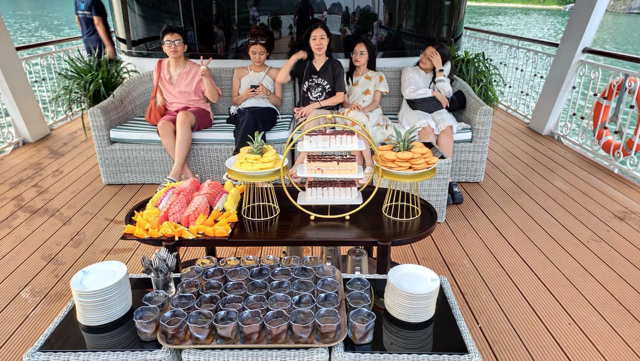 Thưởng thức tiệc trà trong ánh bình minh, bạn sẽ thư giãn hoàn toàn trên không gian du thuyền, đắm mình trong khung cảnh bình yên và tuyệt đẹp của buổi sáng sớm trên vịnh Lan Hạ.