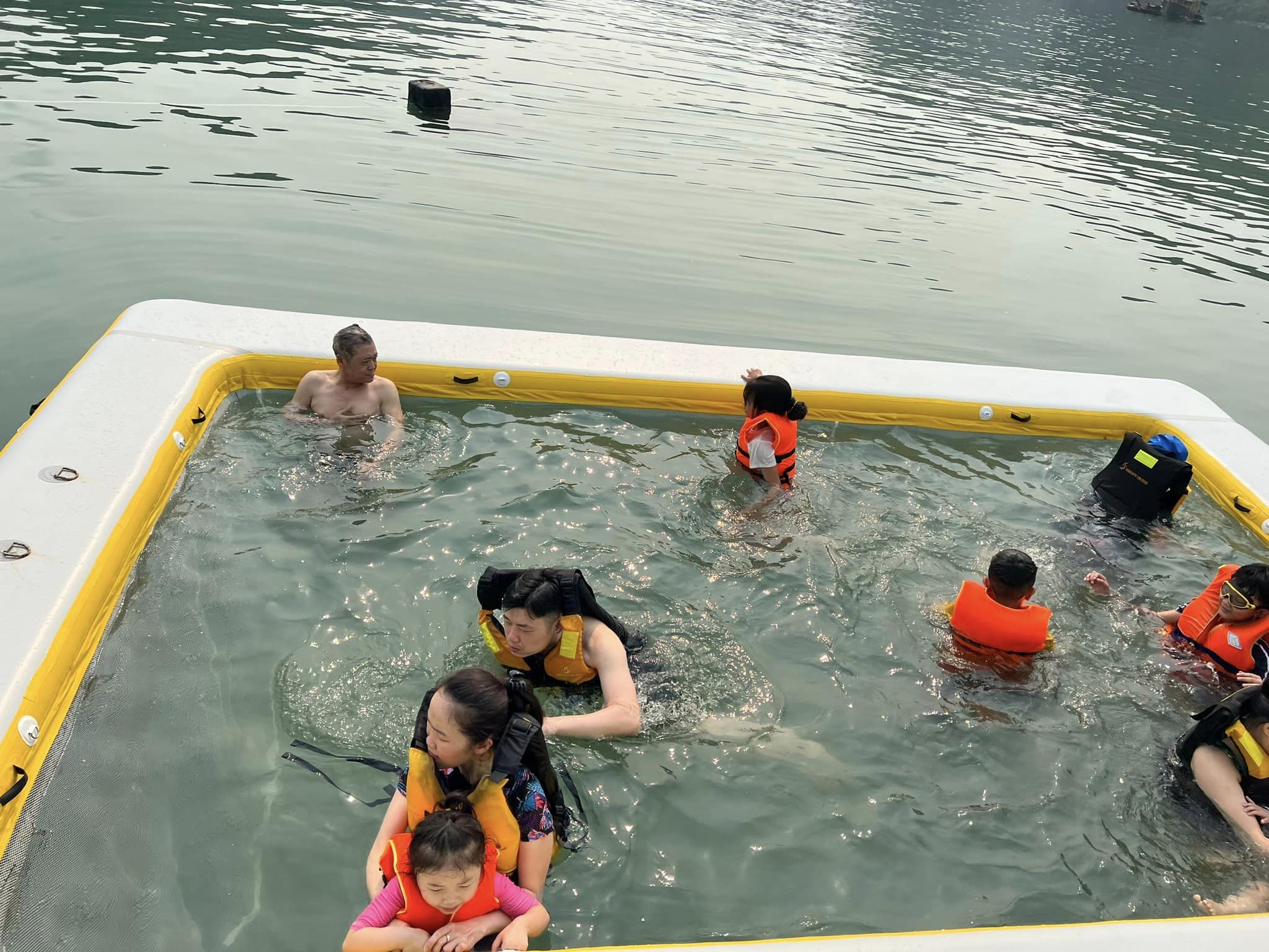 08:00: Du thuyền dừng tại một khu vực biển lặng giữa lòng di sản. Đây là lúc để bạn tham gia vào các hoạt động ngoài trời sôi động như tắm biển trong làn nước trong xanh, nhảy tàu từ trên cao xuống và vui chơi tại bể bơi phao khí siêu lớn.
