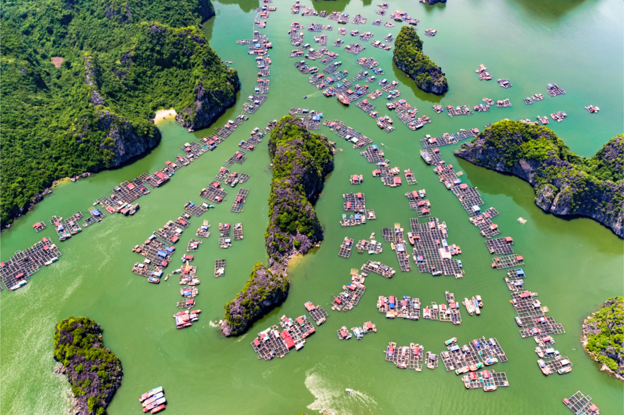 Tàu di chuyển qua làng chài Cái Bèo, nơi sinh sống và nuôi trồng hải sản của người dân.