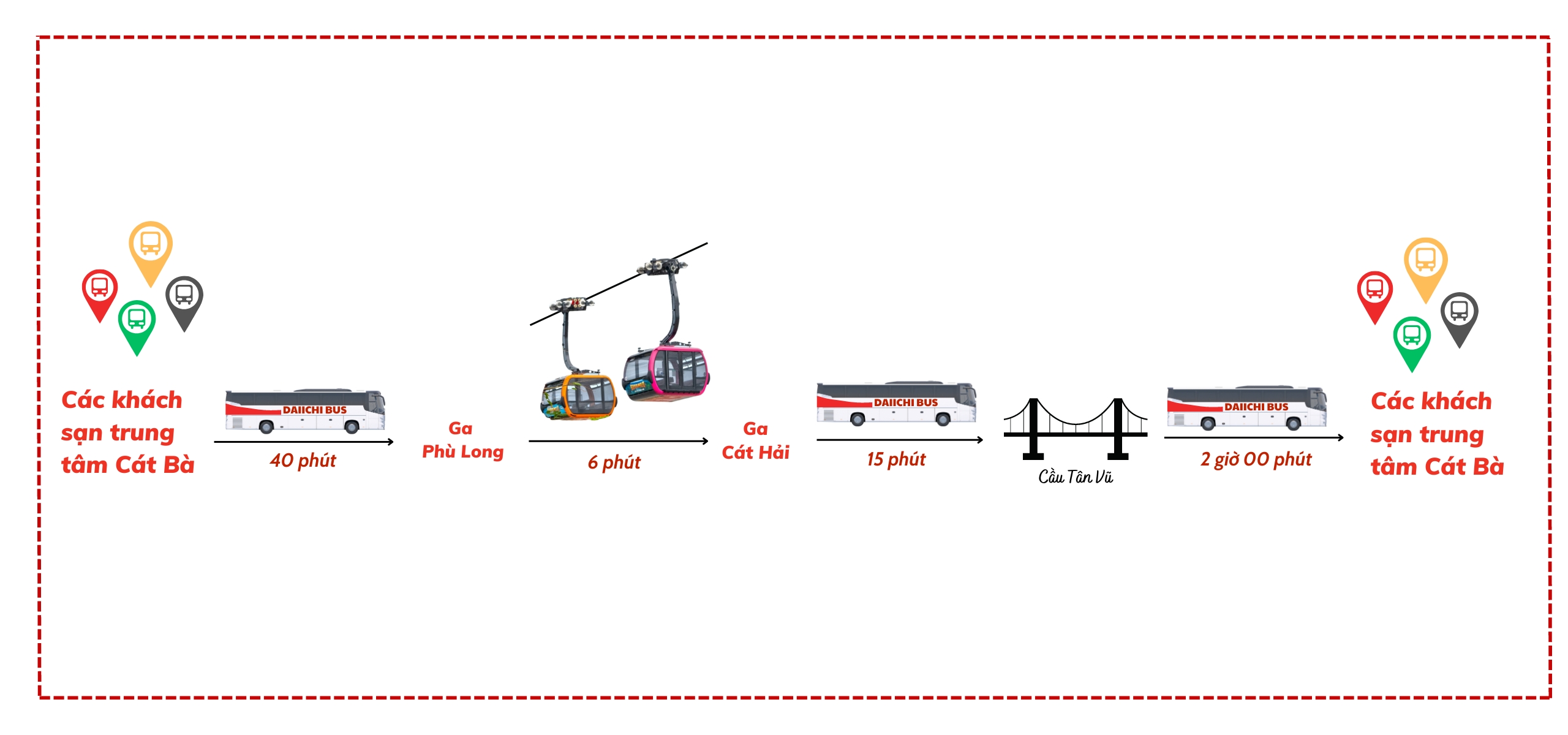 Nhằm mang lại trải nghiệm tuyệt vời hơn cho hành trình đến Cát Bà, Daiichi giới thiệu tuyến xe mới từ Hà Nội đi Cát Bà với sự kết hợp cùng cáp treo vượt biển. Bỏ qua sự phiền toái của việc tắc phà, giờ đây du khách sẽ được di chuyển một cách nhanh chóng và thuận tiện nhất.