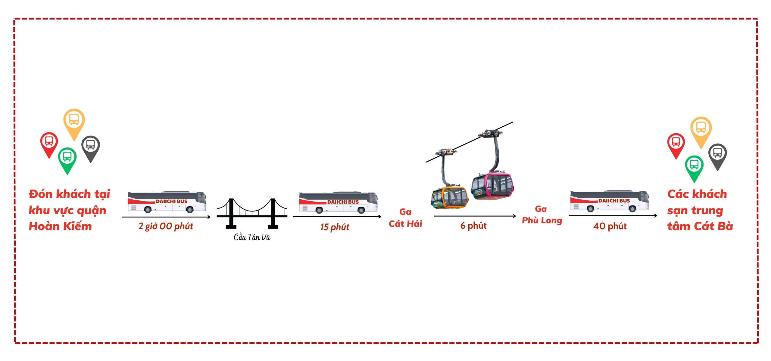 Nhằm mang lại trải nghiệm tuyệt vời hơn cho hành trình đến Cát Bà, Daiichi giới thiệu tuyến xe mới từ Hà Nội đi Cát Bà với sự kết hợp cùng cáp treo vượt biển. Bỏ qua sự phiền toái của việc tắc phà, giờ đây du khách sẽ được di chuyển một cách nhanh chóng và thuận tiện nhất.